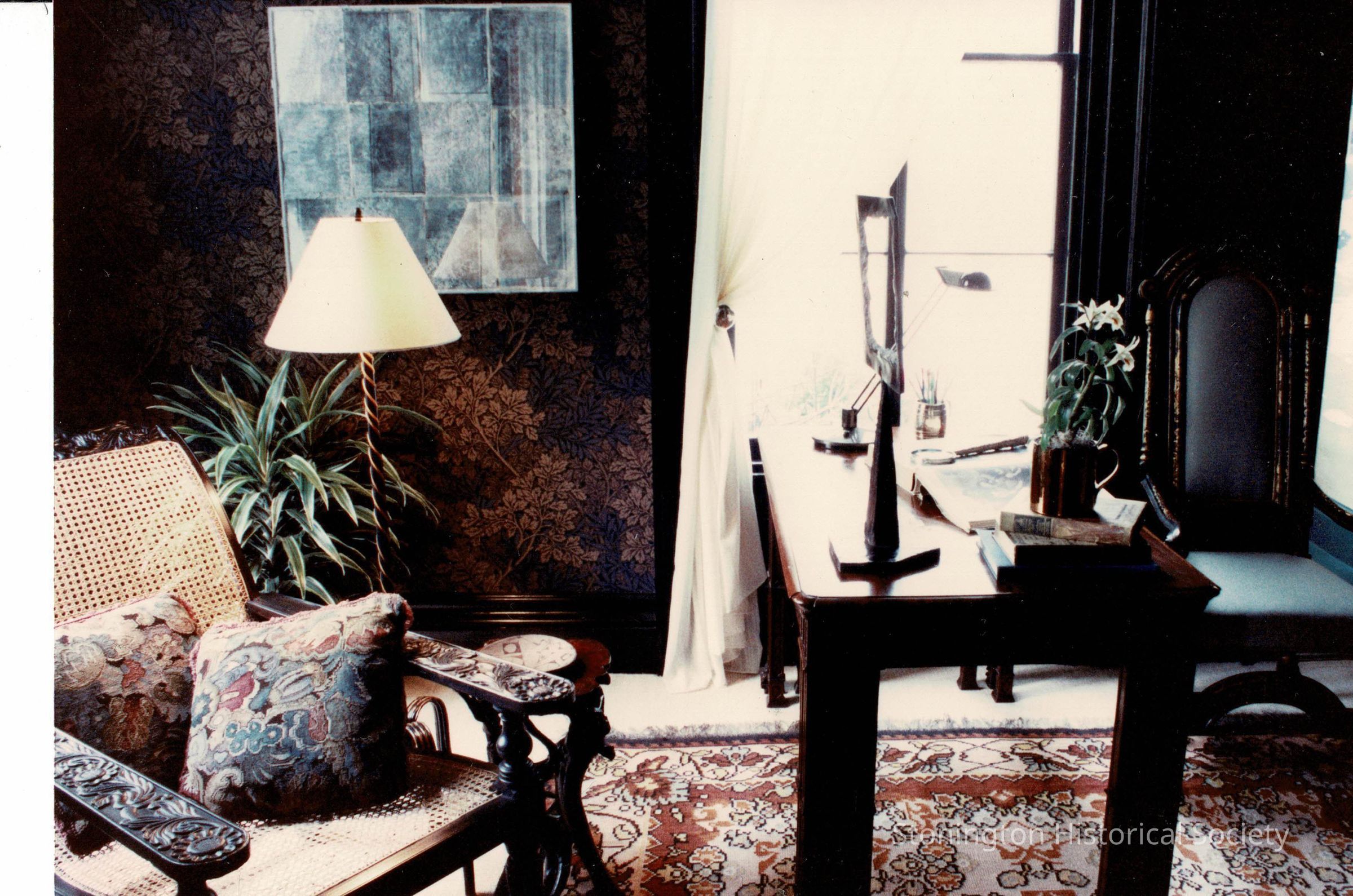 A view of "The Library" as it was decorated for the Designer's Show House in 1989. When the Captain Nathaniel B. Palmer house was constructed in 1852, this room served as Captain Palmer's bedroom. It was reimagined as a Victorian library by design firm Melvin Dwork, Inc of New York.Collection