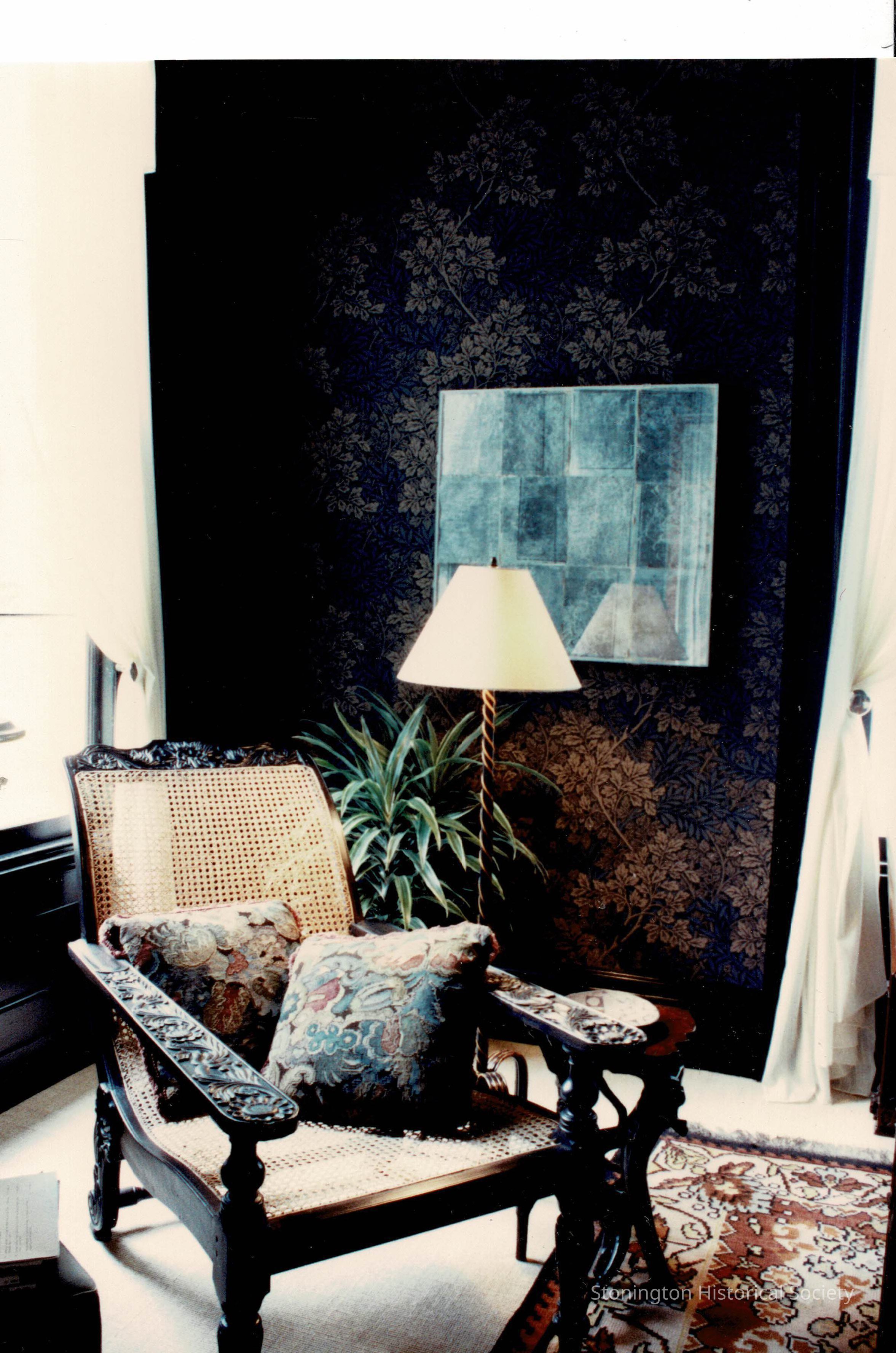 A view of "The Library" as it was decorated for the Designer's Show House in 1989. This room was originally used as Captain Nathaniel Brown Palmer's bedroom when the house was completed in 1852. It was reimagined as a Victorian library by the design firm of Melvin Dwork, Inc of New York. Photograph view is of the north wall.Collection