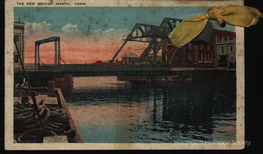 View of Mystic drawbridge from Stonington side with yellow ribbon in upper right hand corner