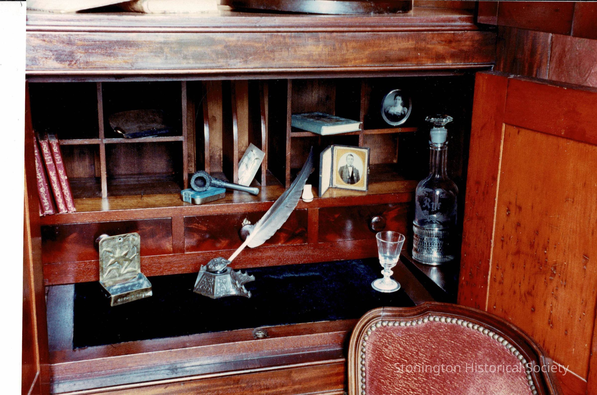 View of "The North Star Room" from the Designer's Show House, 1989. This built in is original to the Captain Palmer House, and served as Captain Palmer's office. This room was reimagined by Brightworks of Essex, CT. Designers: Felise T. Reggio and Ann Soper. Window treatments done by Beth Noyes of Silver Threads, Old Lyme.Collection