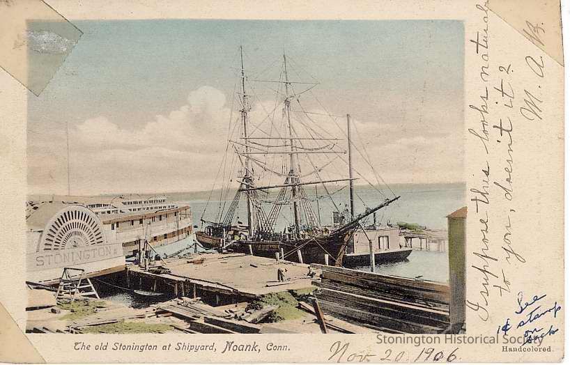Postcard showing steamer "Stonington" at dock at shipyard in Noank CT. Card was sent to Albert Saunders of Carolina RI Nov. 20, 1906