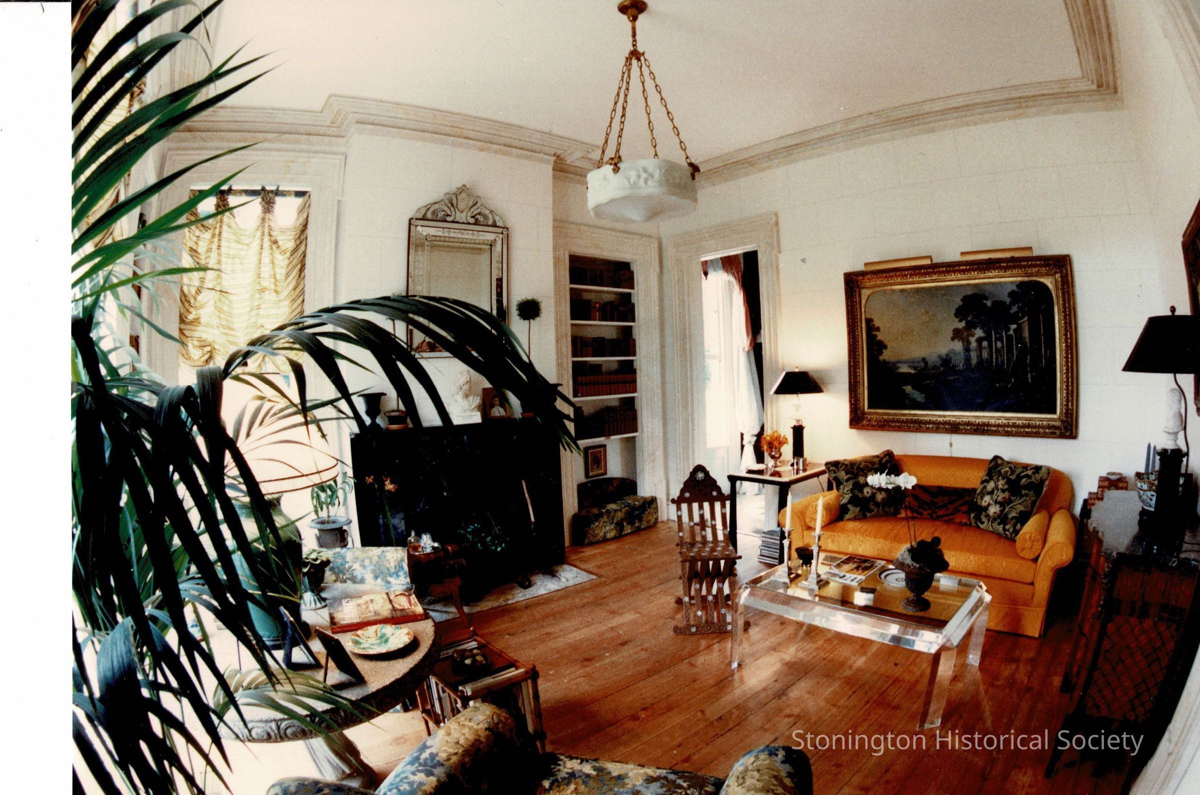 View of "The Reading Room" from the Designer's Show House, 1989. This room now (2024) serves as the Gift Shop of the Captain Palmer House, and was most likely a reception room for businessmen who came to meet with Captain Palmer and would not have been invited into the family’s parlor, across the hall. This room was reimagined as a reading room by Spada and Vanderbeck Interiors at The Business in the Barn, Hadlyme, CT. Designers were Charles Spada and Tom Vanderbeck.Collection