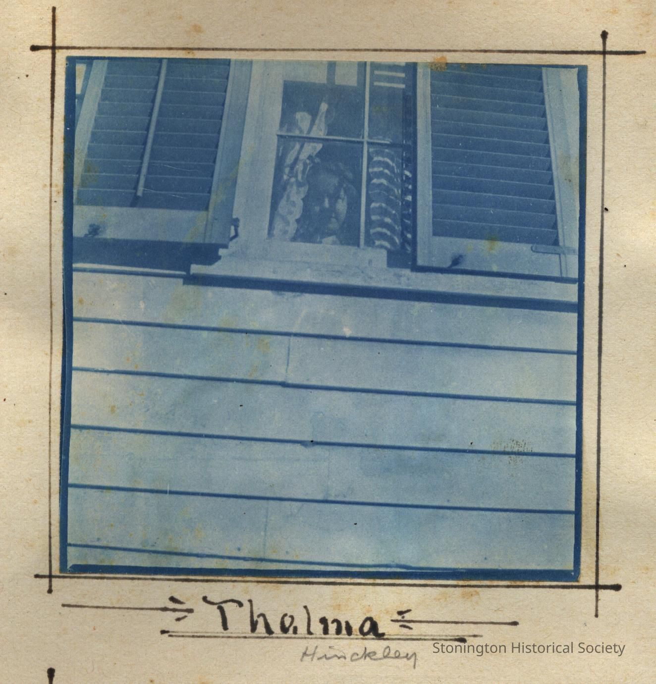 Cyanotype print of Thelma Hinckley looking out of window