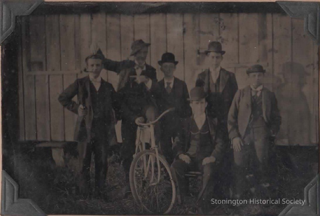 Tintype, "Jack Doyle on bicycle that broke a record from Stonington to Mystic." Group of young men surrounding a bicycle, late 1800s.