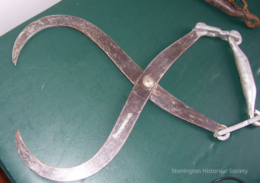 Metal ice tongs are charcoal gray with the company name "Gifford Wood Co" written on the side. A handle is attached with chain links.Collection