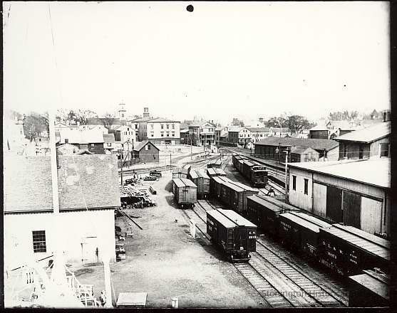 Town landing rail head center rear; Mueller building, Steamboat Hotel. Towers of Baptist Church and Congregational Church in background