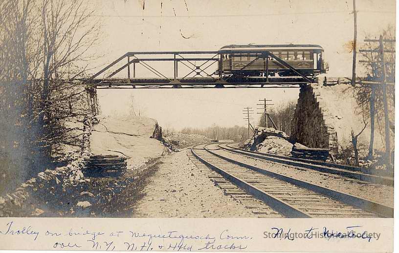 Trolley going over trestle at Wequetquock. Note on front of card indicates this was the New London to Westerly trolley passing over the NY, NH and Htfd tracks.