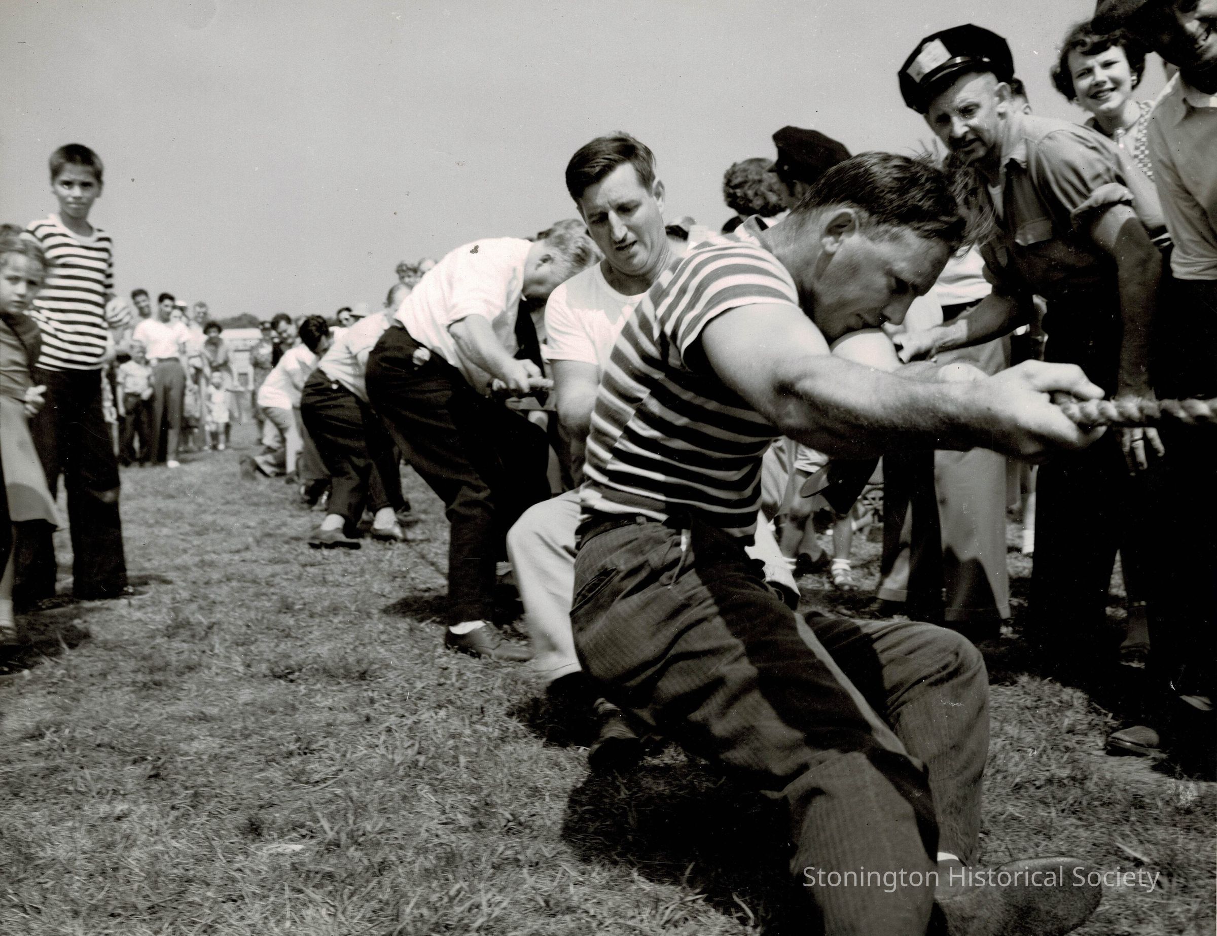 A black and white photograph of the tug of war held on August 6, 1949 for the Stonington Tricentennial. Photograph taken by Maurice La Grua. This tug-of-war was between teams of the Volunteer Fire Companies of Stonington and North Stonington.Collection