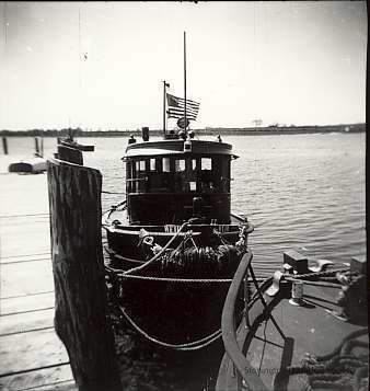 Tug tied up at dock MLG-232 has print and negative in section of book titled "Boats, Steamer, Harbor, Breakwater"