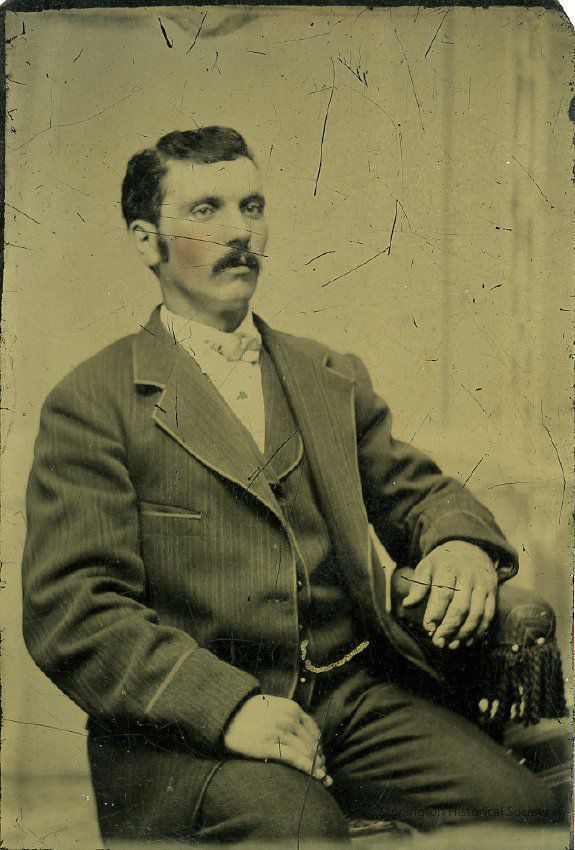 Unknown man in chair with mustache and dark hair.Collection