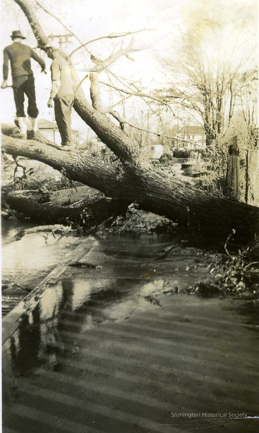 Upended tree with two men standing on a limb; fence that was knocked down under the tree and water. Other houses in backgroundCollection