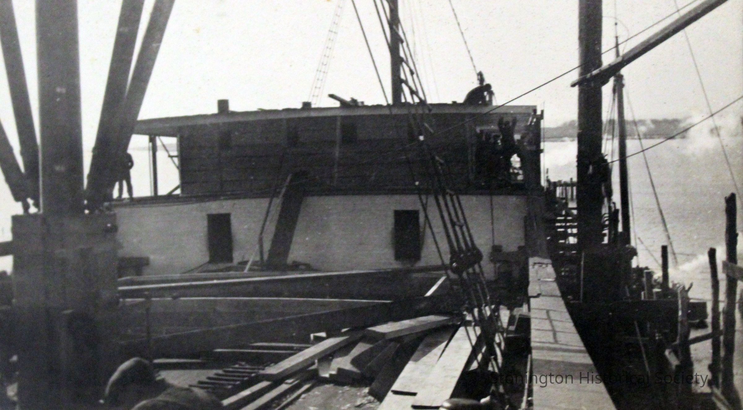 Rebuilding of the SS Lansing in Stonington, early 1919. Photograph was taken on the upper deck, looking toward the area where the pilot house and bridge were being constructed. The Lansing steamship was rebuilt by the Ship Construction and Trading Company, Inc. of Stonington for the Nafra Company of New York.Made/Created