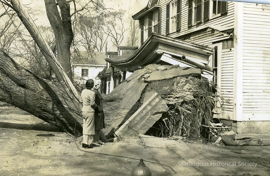 Uprooted tree that pulled up sidewalk in front of house causing damage with person standing in front