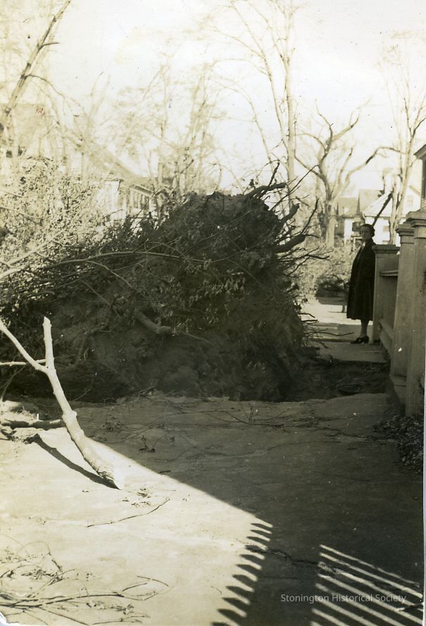 Uprooted tree with woman standing on right side in front of fence