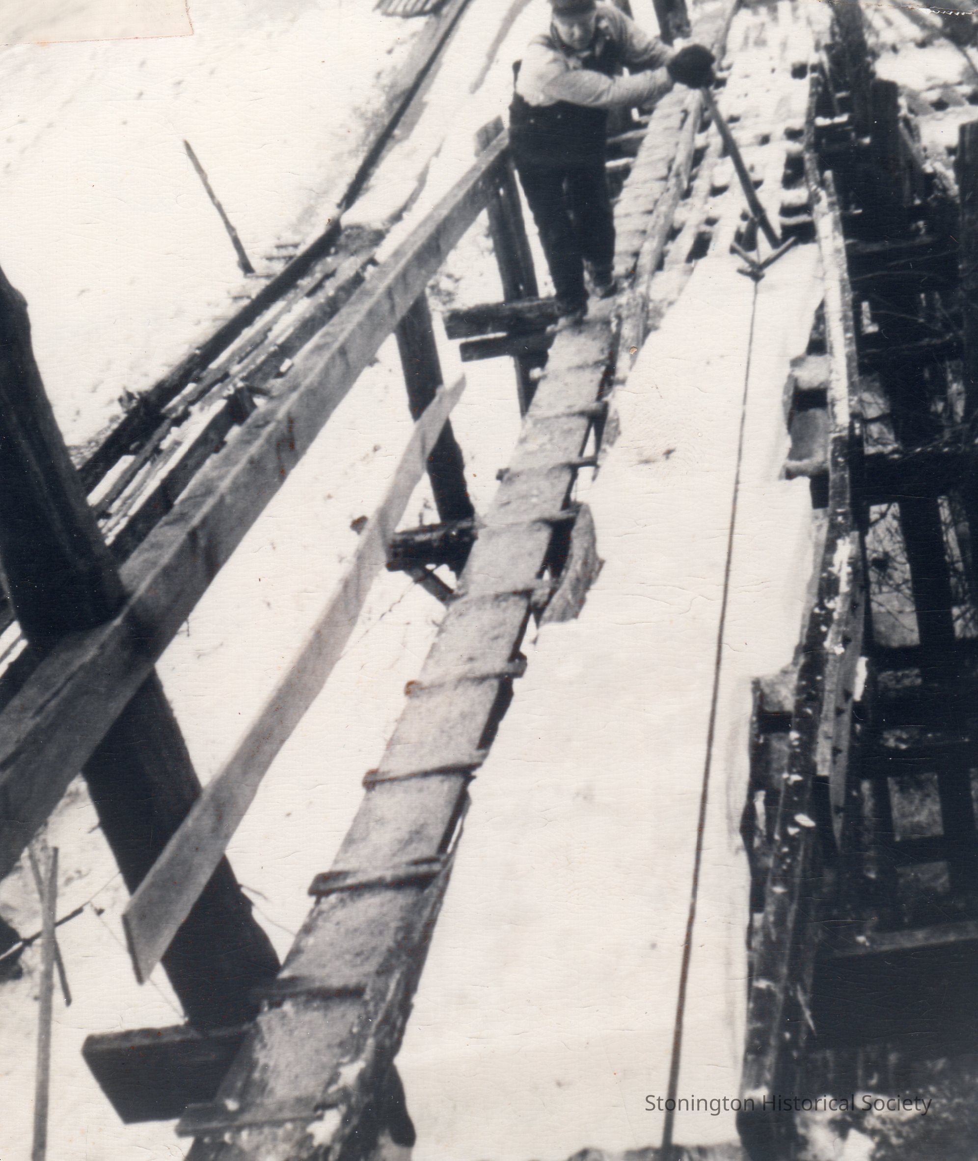 Black and white photograph of the Vargas Brothers Ice Company harvesting at ice at Sylvia's Pond in the winter of 1937 (2 copies). Handwritten on back: "19, 20 + 21 Jan. 1937. 'Big Ship' Adams guides to cakes up the chute. His job is most hazardous for occasionally an ice cake will jump the guide boards. For all of his 210# Ship is light on his feet and this quickness has avoided many a nasty smash-up. Joe Gordon. Lower Ice House." Second caption: "Ice storage operations - Vargas Lower Icehouse - January 1937. Hookman Skip Adams is riding a load of ice to East Main Room."Collection