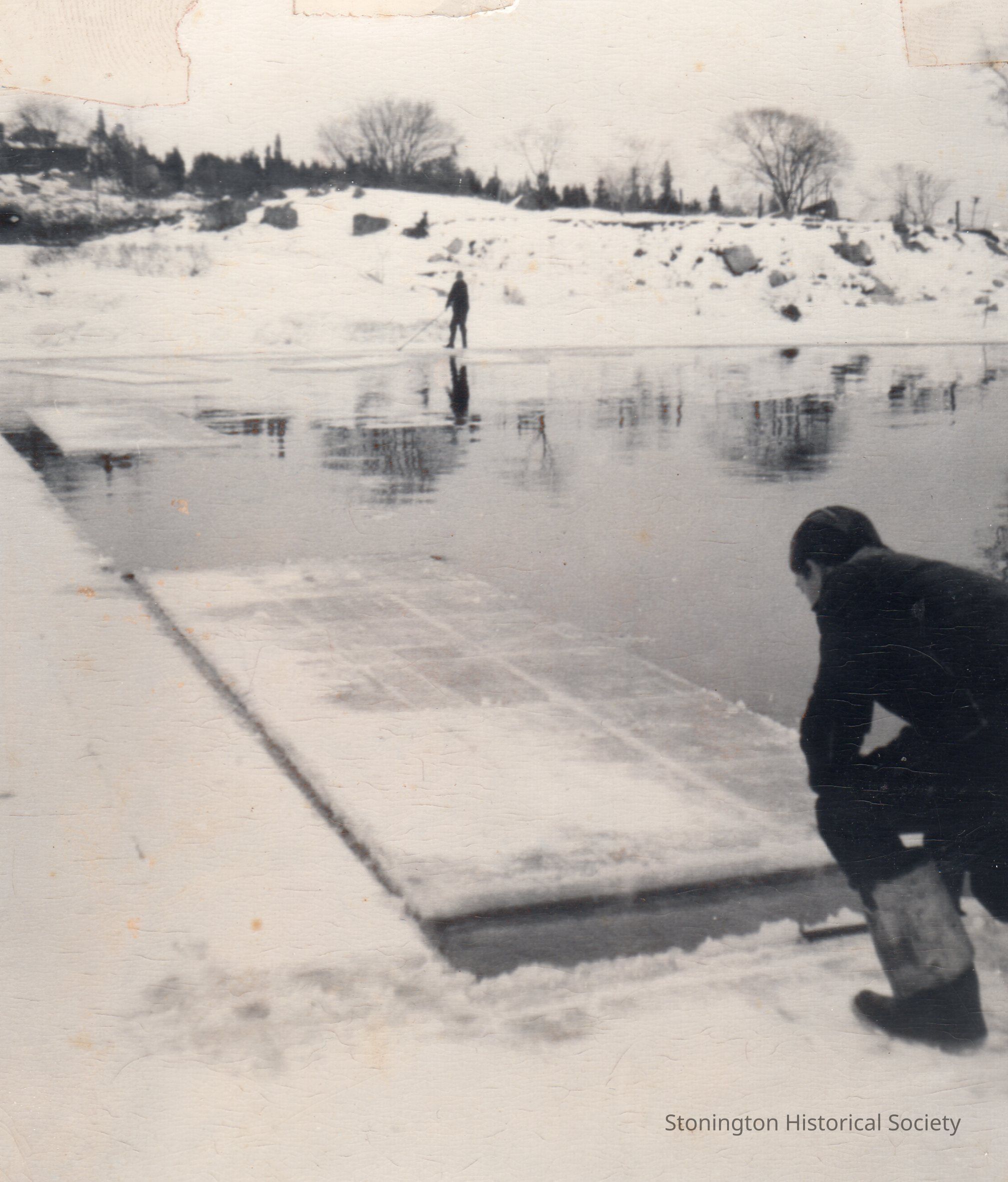 Black and white photograph of the Vargas Brothers Ice Company harvesting at ice at Sylvia's Pond in the winter of 1937. Handwritten on back: "Floating the cakes down to the chutes where they will be broken into pieces weighing 150# each. Joe Gordon. Bill Bunnel on right, Sherman Chase in background. 19, 20, 21 Jan 1937 at Lower Ice Pond."Collection