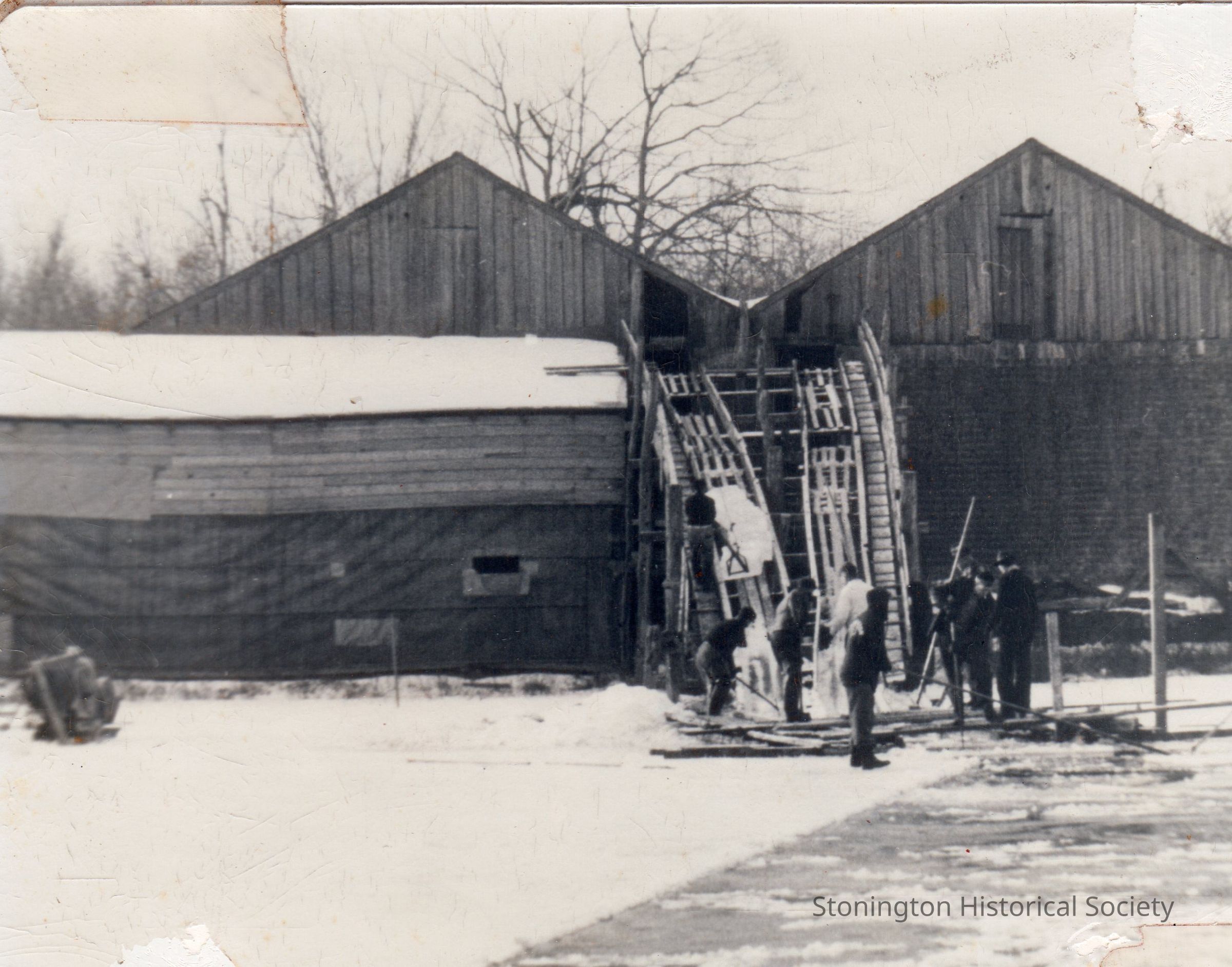 Black and white photograph of the Vargas Brothers Ice Company harvesting at ice at Sylvia's Pond in the winter of 1937. Handwritten on back: "Jan 1937. Upper Ice House. Joe Vargas Sr. with long pike."Collection