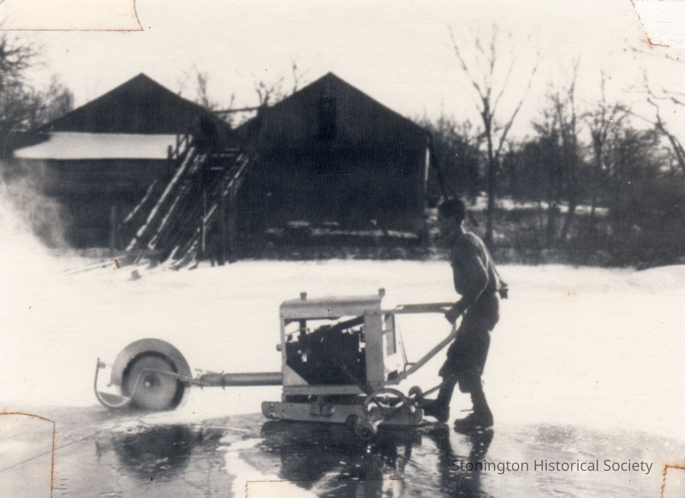 Black and white photograph of the Vargas Brothers Ice Company harvesting at ice at Sylvia's Pond in the winter of 1936. Handwritten on back: "Jan 30 + 31 + 1 Feb. 1936. Rich Vargas. Upper Ice House."Collection