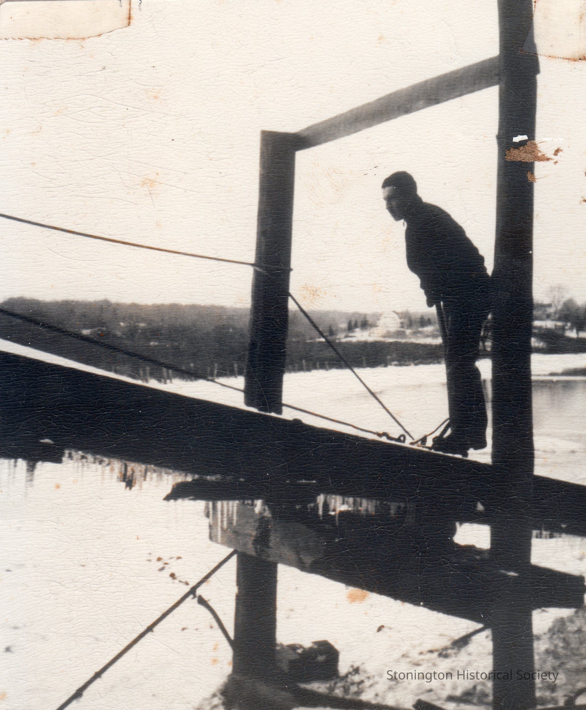 Black and white photograph of the Vargas Brothers Ice Company harvesting at ice at Sylvia's Pond in the winter of 1937. Handwritten on back: "Jan 1937. Paul Bergel, former SHS sprint star, handles the smaller chute. He rides the ice cakes as if he was mushing a dog-team. This job is the coldest of all for there is less activity, but nonetheless it is a most thrilling one as per Joe Gordon."Collection
