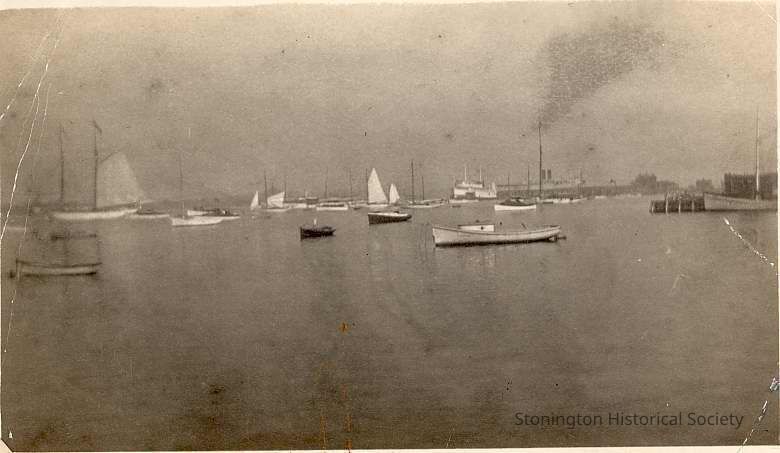 Early days in Stonington Harbor with various craft and line steamer in distance.