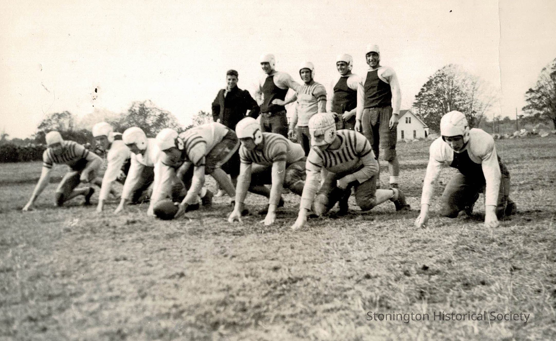 Black and white photograph showing the Stonington High School football team, in the fall of 1936, on the playing fields behind the modern-day High School. Members of this year's Varsity team include: Lenard Reid, Robert Brannegan, Charles Rippel, John Gatchek, Seneca Allyn, Anthony Campo, James Spellman, Robert Holly, Ernest Cravinho, David Austin, George Oak and James Emilio.Collection