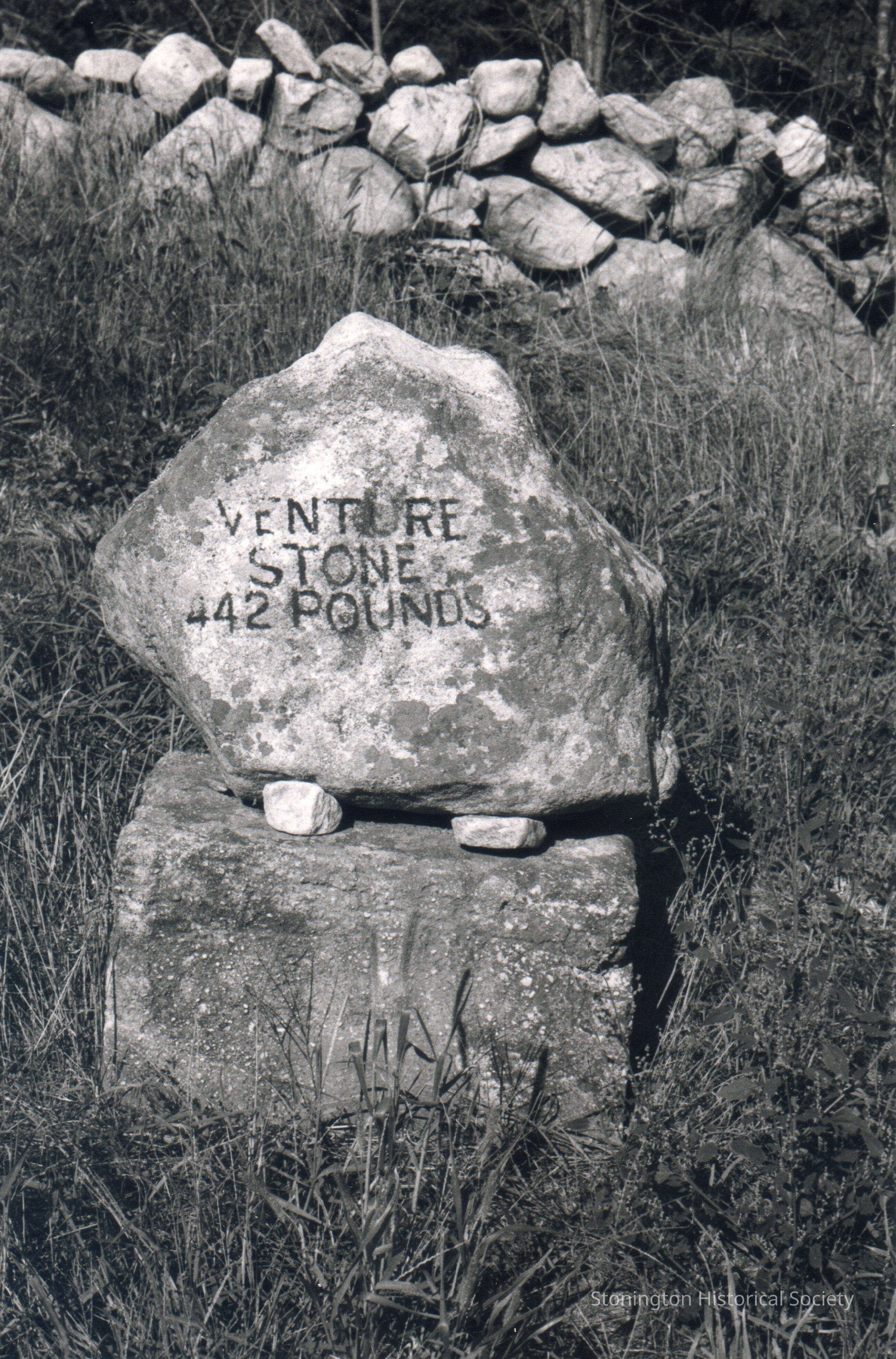 Black and white photograph of the Venture Smith stone at the Stanton-Davis Homestead. Venture Smith is said to have moved this stone from the fields while enslaved by Thomas Stanton. Photographed by Mary Thacher.