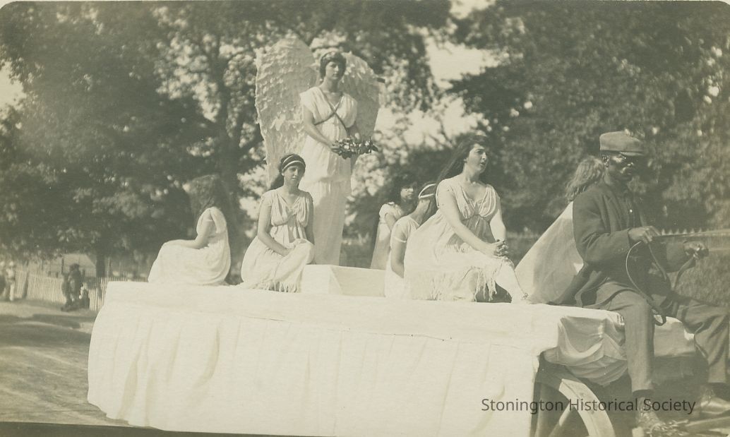 symbolic figures on float and walking: Misses Leah Connell, Vera Bradley, Pauline Spargo, Ethel Pollard, Anna Vargas, Mary Hunt, Alma Killars, Thelma HinckleyCollection