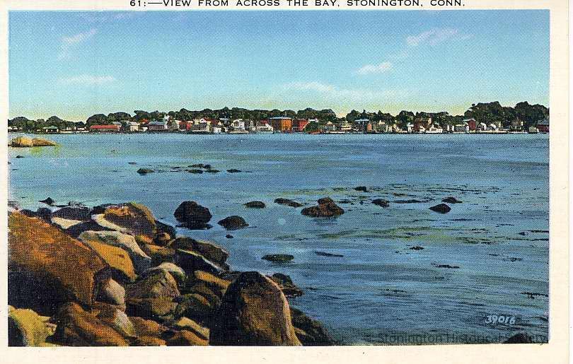 Stonington Harbor from across the bay. View of Stonington Village from south end of Wamphassuc Point.