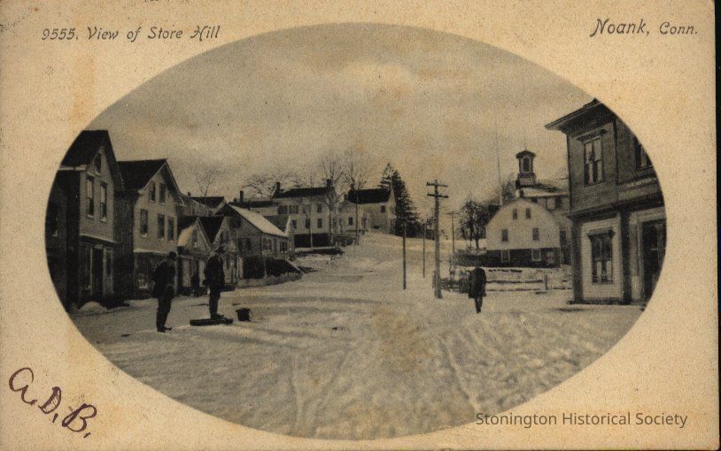 Postcard of Noank CT in the winter with snow and people in street sent to Miss Maud Holdridge, Riverpoint RI Dec 13 1905