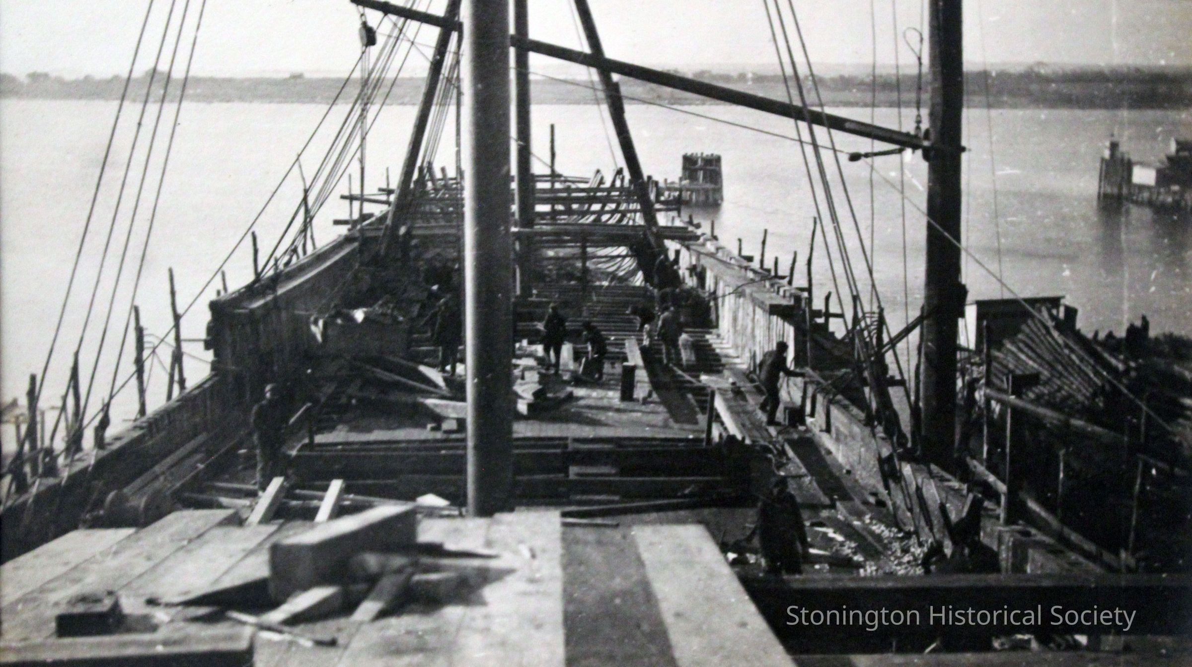 View looking down the length of the SS Lansing's upper decks, most likely taken from the top of the pilot house. Stonington Harbor and Wamphassuc Point are visible in the background. The Lansing steamship was rebuilt by the Ship Construction and Trading Company, Inc. of Stonington for the Nafra Company of New York.Made/Created