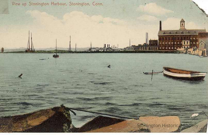 Old postcard of view up Stonington Harbor showing Atwood Machine Co. facing east