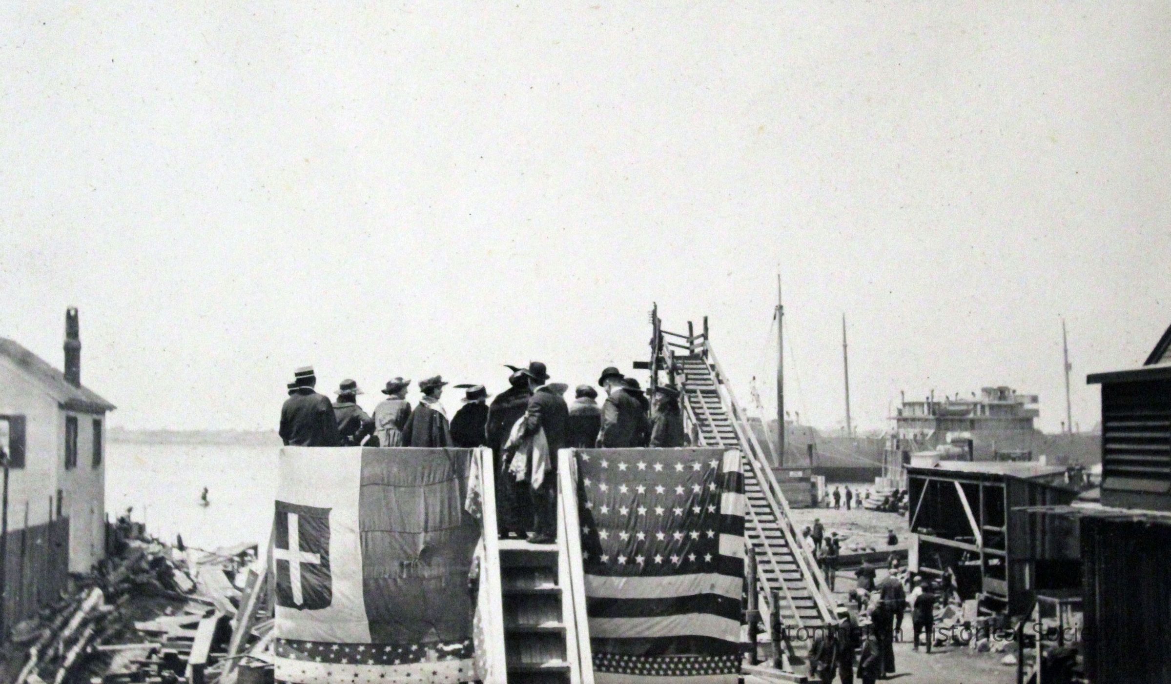 After the accidental launch of the SS Lansing, on May 20, 1919. Dignitaries, company representatives and their families arrived for the launching, only to see that the ship had slid into the water early. The group looks toward the harbor from the viewing platform. The Lansing steamship was rebuilt by the Ship Construction and Trading Company, Inc. of Stonington for the Nafra Company of New York.Made/Created