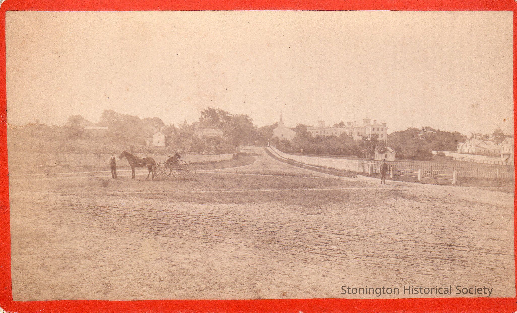 Photograph mounted on board, Main Street looking south towards Wadawanuck Square. Handwritten on back: "Wadawanuck Hotel and the back of the Babcock House", Stonington Borough, c. 1880. Belonged to Henry Palmer, Jr.