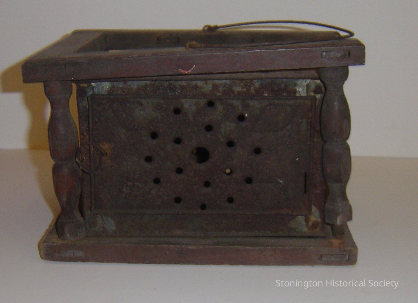 foot warmer, wood and perforated tin with diamond motif