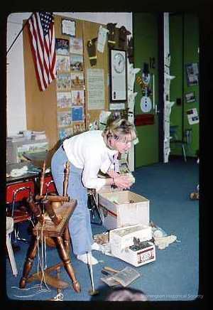 Mrs. Smith showing examples of washed and cleaned wool to students at Dean's Mill SchoolCollection