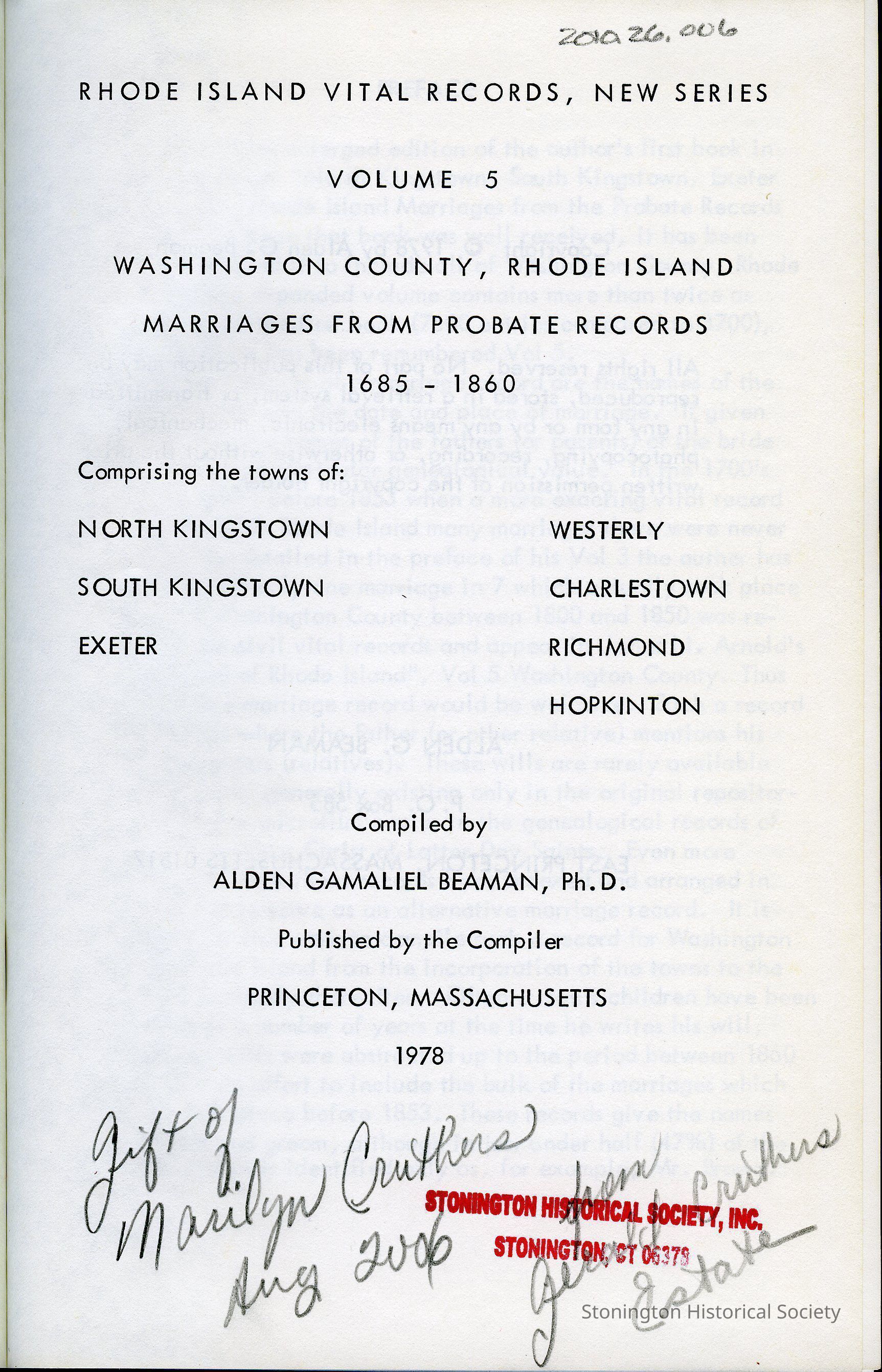 Washington County, Rhode Island marriages from probate records, 1685-1860 : comprising the towns of North Kingstown, South Kingstown, Exeter, Westerly, Charleston, Richmond, HopkintonEntry/Object ID