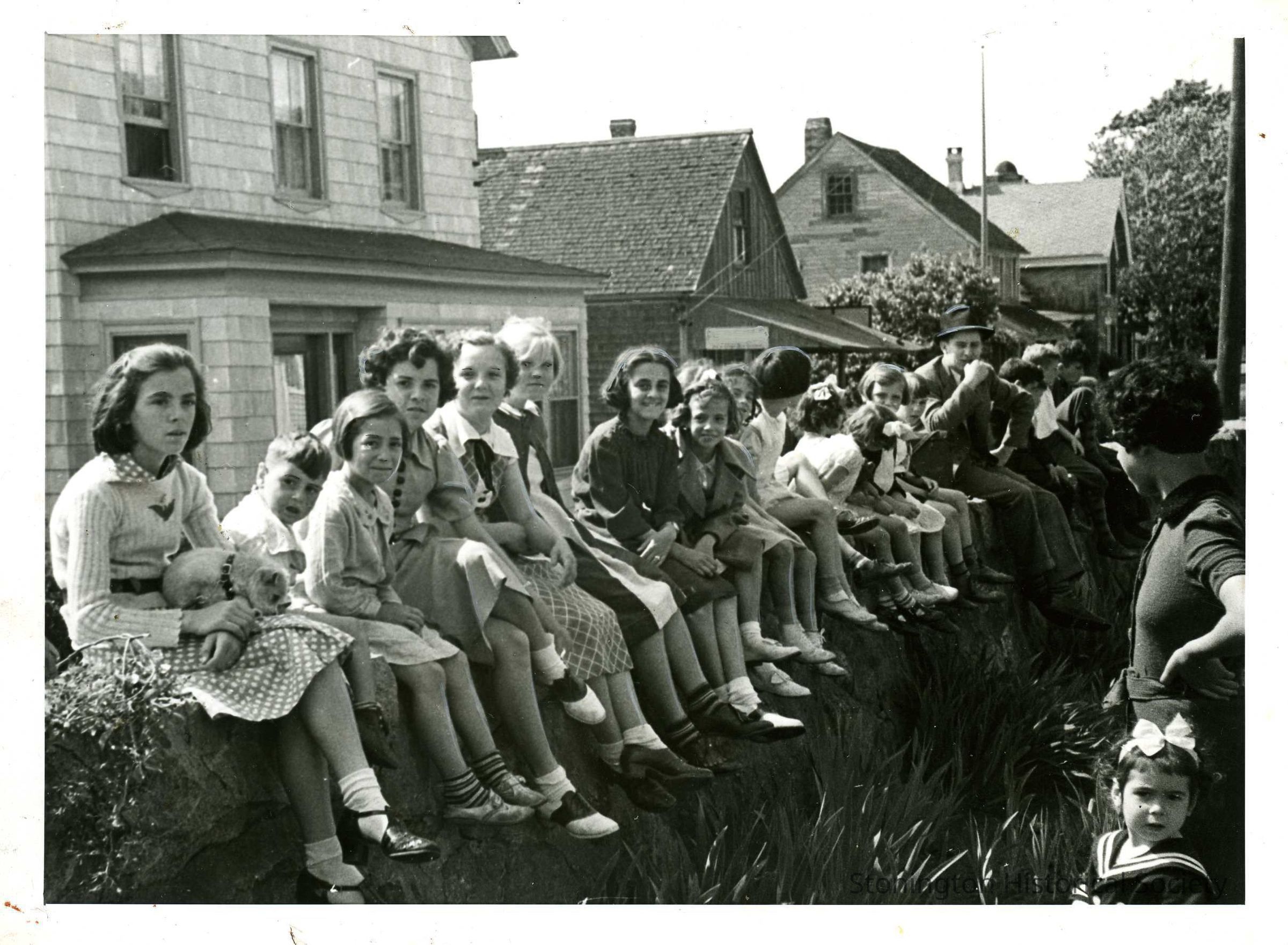 A black and white photograph showing the children and some adults of Stonington, seated along a stone wall. None are identified, but the reverse of the photograph has the following: "Children of Stonington had a good time watching the antics of the camera addicts."Collection