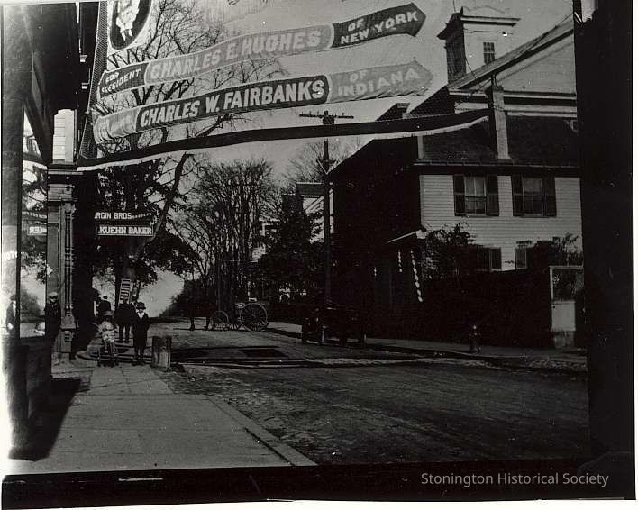 Water Street, north from Pearl Street, 1917(?) with election banners for Charles E. Hughes of New York and Charles W. Fairbanks of Indiana