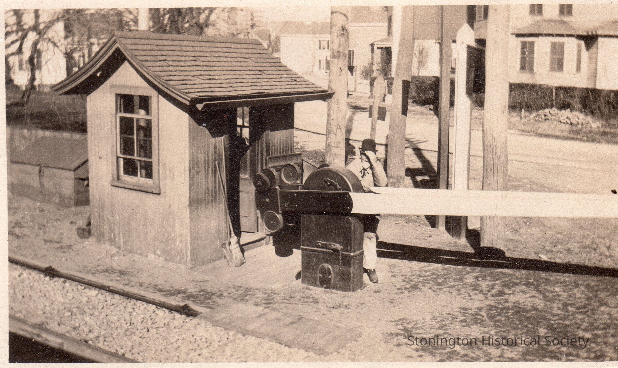 Photograph from the Harry Northup album (2015.019.002), black and white snapshot (with enlarged print), Railroad Gate Tender on North Water Street. "This picture shows the Gate Tender about to raise the gates. He has a neat bowler hat on. This is located at the Water Street crossing on the corner of Water Street and Cutler Street in Stonington, CT."Collection
