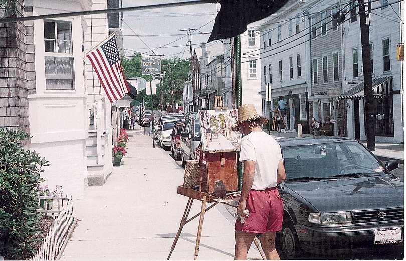 Street scene of Stonington CT showing street painter on Water Street