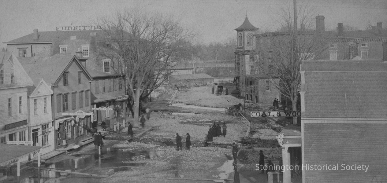 View of West Broad Street looking east after the great flood of February 1886 in the Westerly, RI/Pawcatuck, CT area. The furniture store on the left later became Higgins Pharmacy. (Per note on reverse of photograph)Made/Created