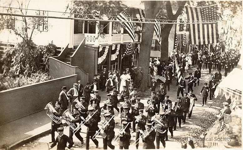 The Westerly Band on Water Street during Fire Parade, part of Celebration of the Battle of Stonington, 1914.