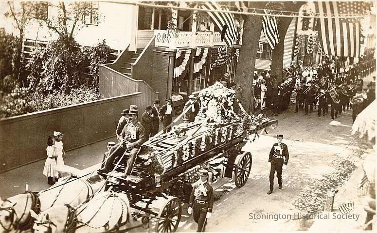 The Westerly Hook and Ladder company on their horse-drawn wagon with the Westerly Band following on Water Street during Fire Parade, part of Celebration of the Battle of Stonington, 1914.