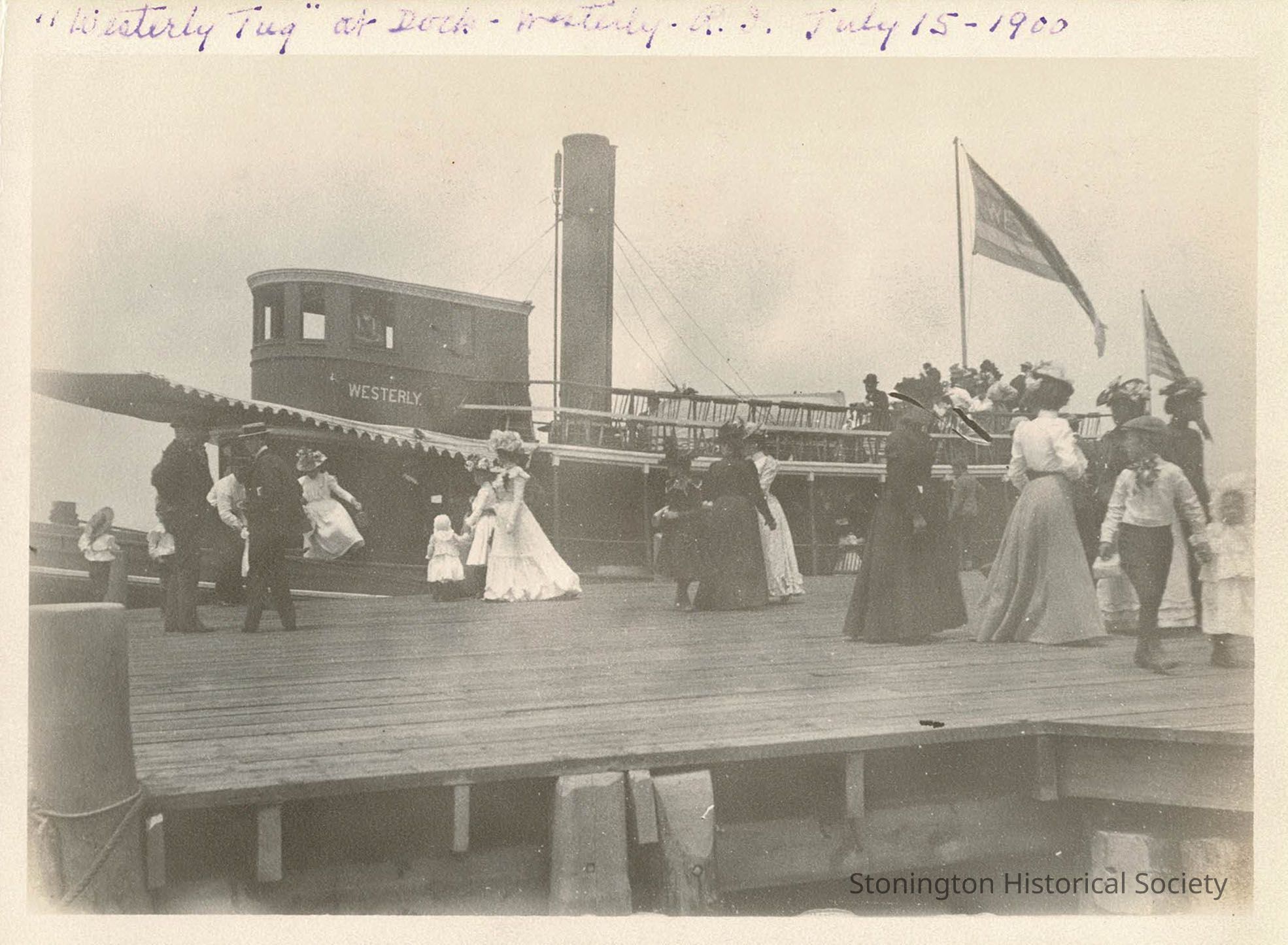 Image shows mostly women and children boarding the "Westerly" tugboat at the dock in Westerly, RI.Collection