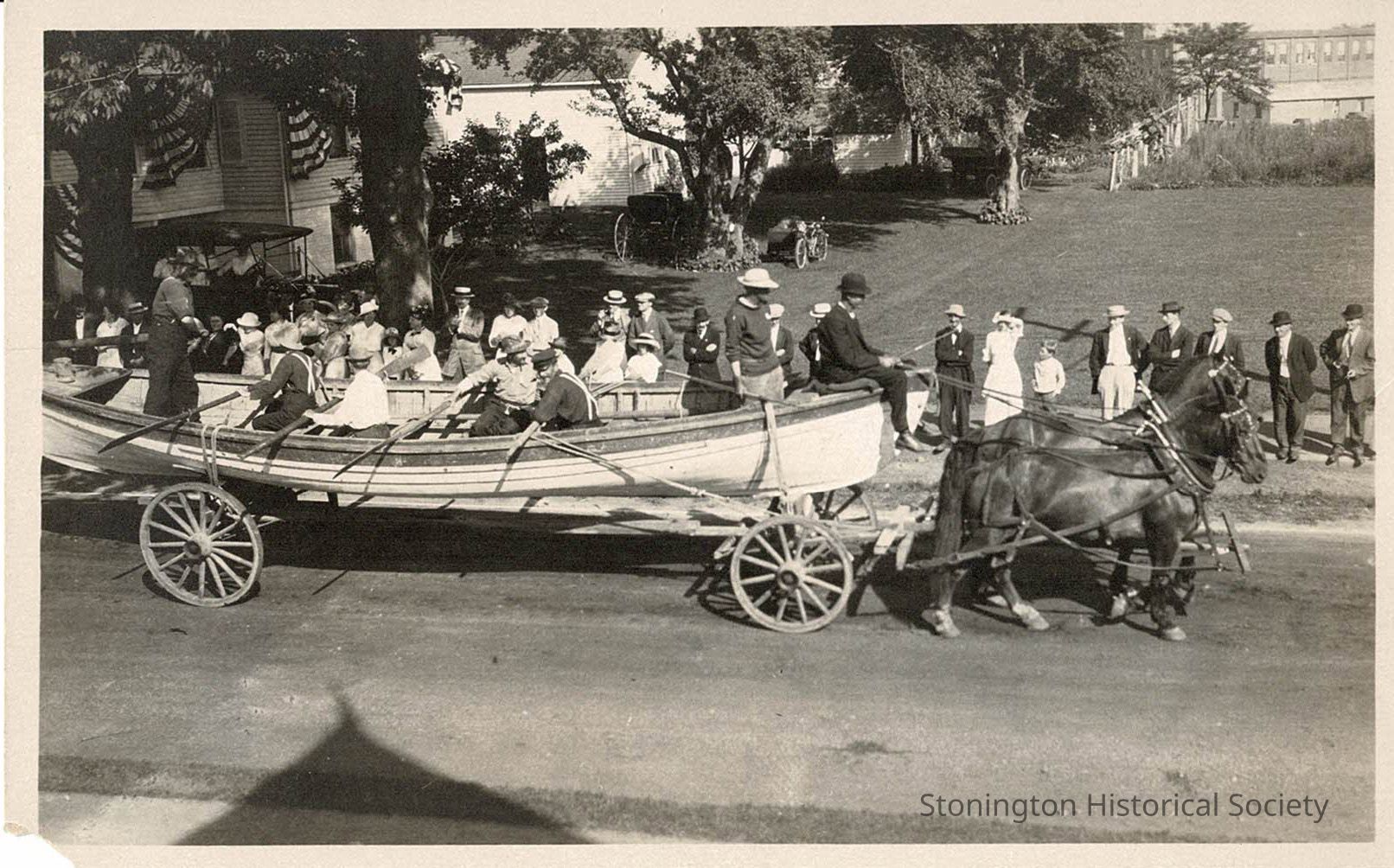 Photographic postcard depicting the Whaling Days float for the Battle of Stonington centennial in August 1914. The gentleman standing at the rear of the boat is identified as Charles E. Staplin 2nd. The man standing at he front of the boat with the light colored hat, holding the harpoon is identified as William H. Hallett. Reverse of the photograph identified the two men above and reads : "The whaleboat was brought expressly from New Bedford for the pageant." Photograph taken on Elm Street near the Town Hall, the Velvet Mill is visible in right background.Collection