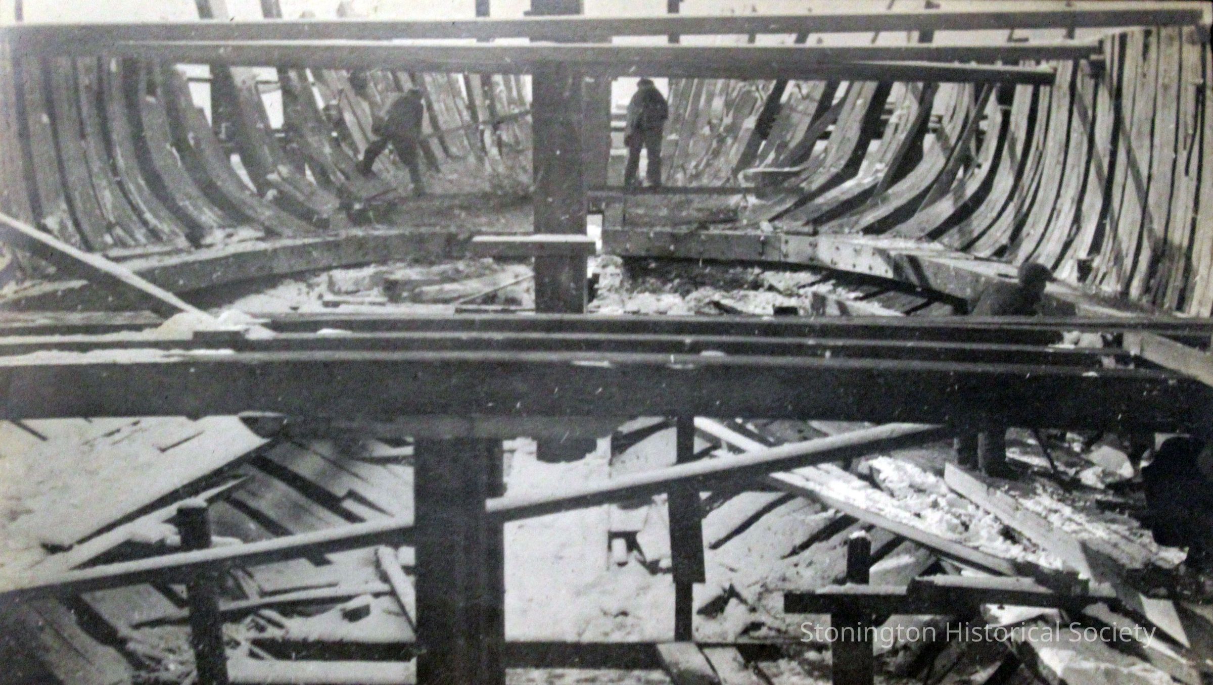 View of the SS Lansing under construction at Stonington dock taken in the winter of 1918-1919. The image shows the interior of the ship, in winter, where a few workers are visible. The Lansing steamship was rebuilt by the Ship Construction and Trading Company, Inc. of Stonington for the Nafra Company of New York. Scaffolding, braces and supports are visible, all covered in snow.Made/Created