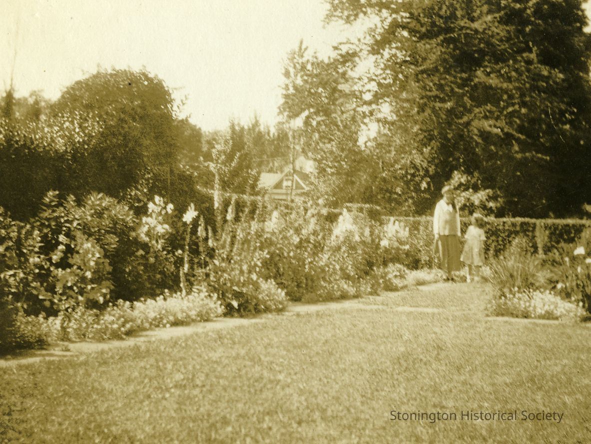 Woman and child in garden at "The Hill," residence at 35 Grand Street