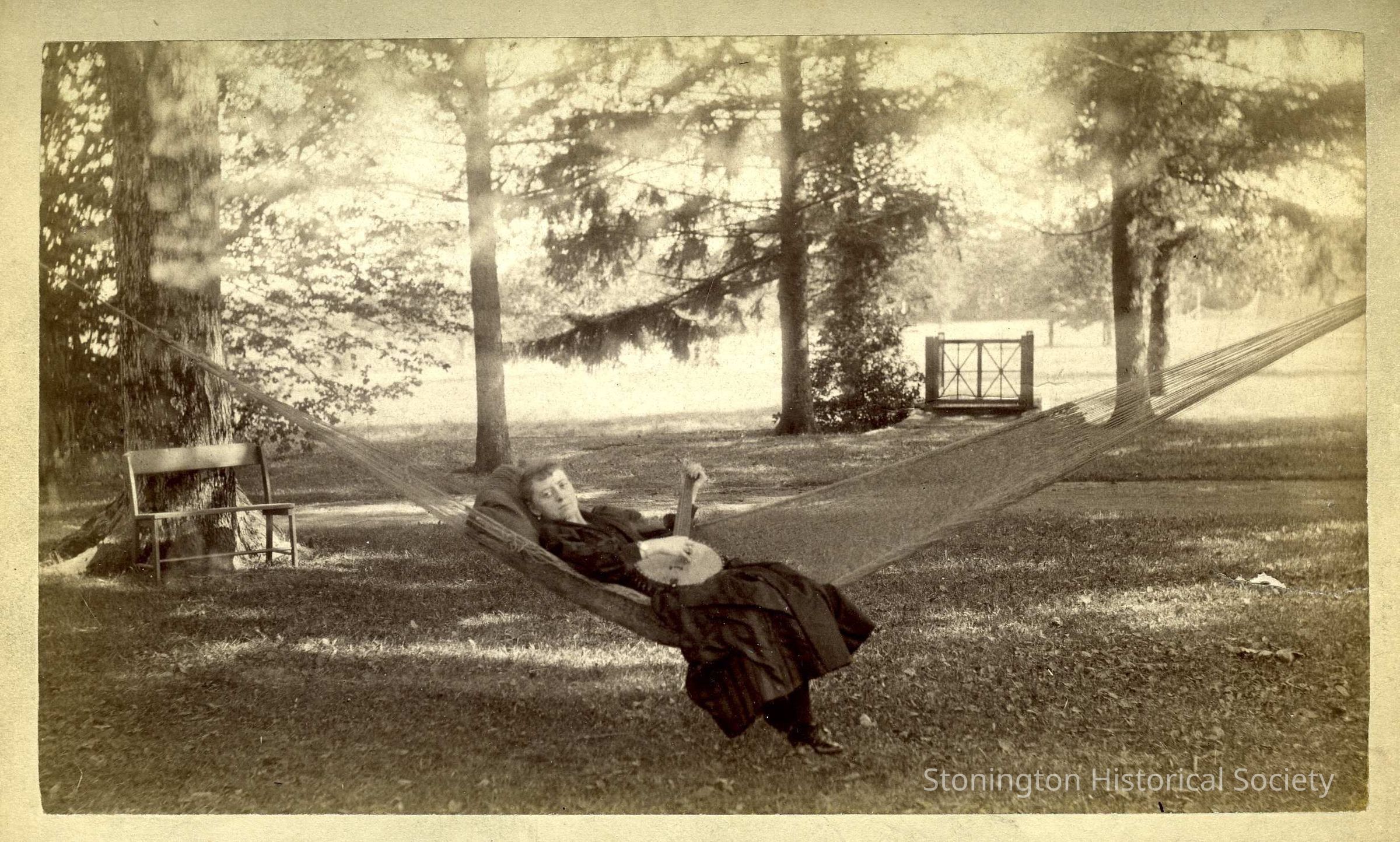 A photograph of a woman in a dark dress laying in a hammock with a banjo. She is not identified, but is in the front yard of Stone Acres Farm. Judging by the time period, she could be Libbie C. McCune who sold the farm to E.P's uncle in Erskine Phelps, in 1902. She could also be Eliza Kendall Adams, the wife of Eugene Phelps Edwards in 1912.Collection