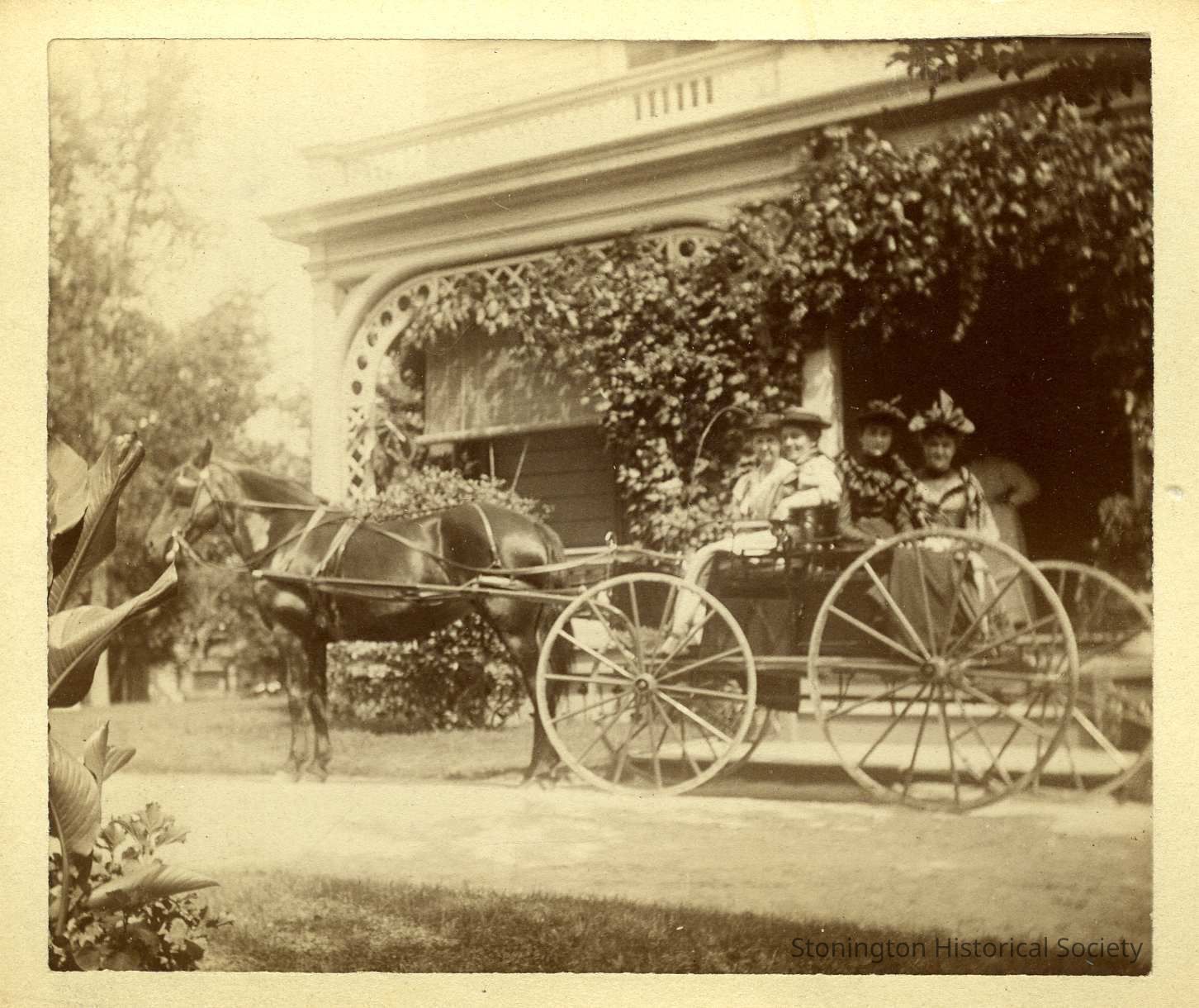 A photograph of four women seated in buggy in front of Stone Acres. The women are unidentified but may be Eliza Kendall Adams and her family members, or women in town for the family reunion pictured elsewhere in this collection.Collection