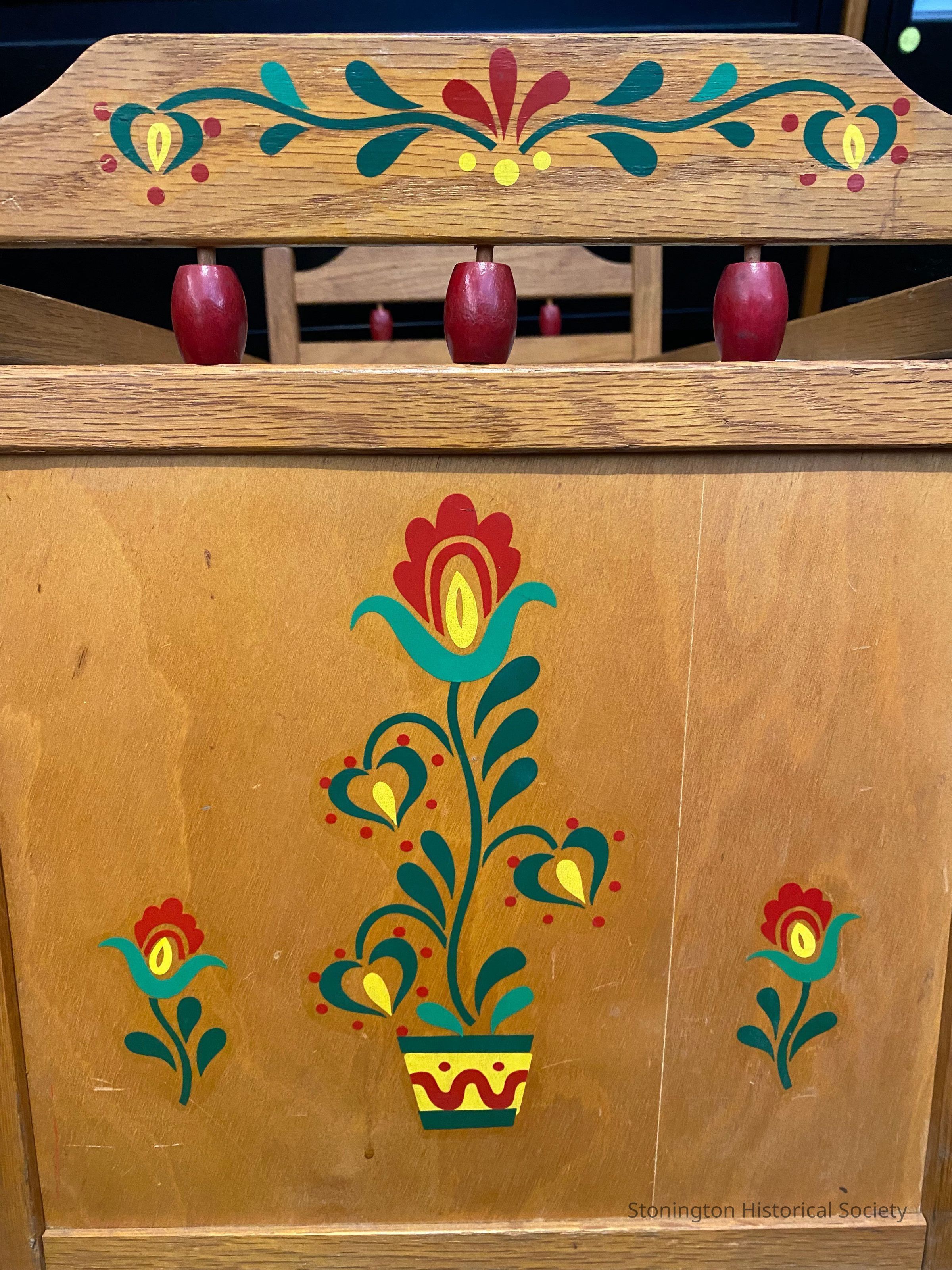 Wooden doll crib, possibly handmade, from the 1950s. Measures approximately 25 inches long by 13 inches wide. Headboard is 17.5 inches tall, footboard is 15.5 inches. Slat sides and bottom with solid head and footboard. Red bead detail and green, red and yellow floral motifs painted on footboard and headboard. Have found no maker's mark, so may not have been commercially manufactured. Also includes homemade feather mattress with blue stripe and rose fabric. Small scuffs from use.Collection